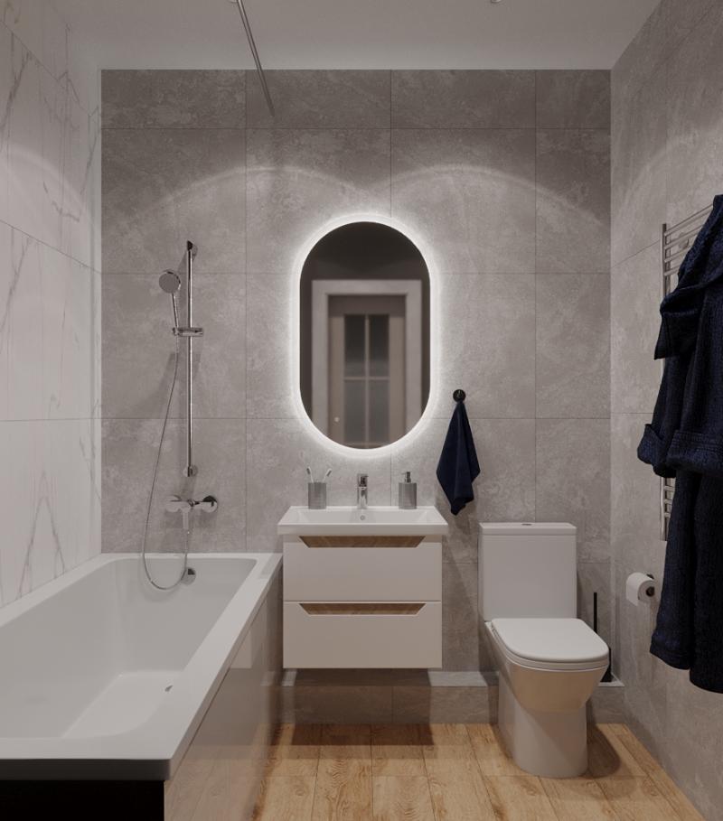 - Оборудование: Ванна акриловая 170*70, смеситель для ванны с душем, раковина с тумбой, смеситель для раковины, зеркало, полотенцесушитель, унитаз компакт с бачком, вентилятор, светильники встраиваемые, розетки, выключатели