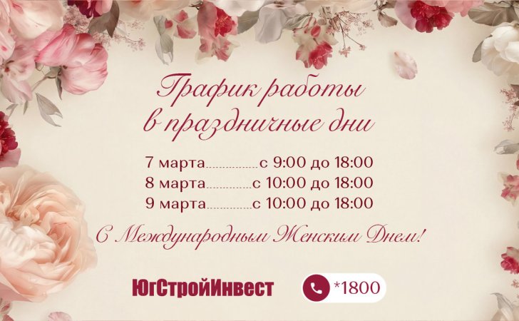 График работы офисов ГК «ЮгСтройИнвест» в праздничные дни к 8 Марта